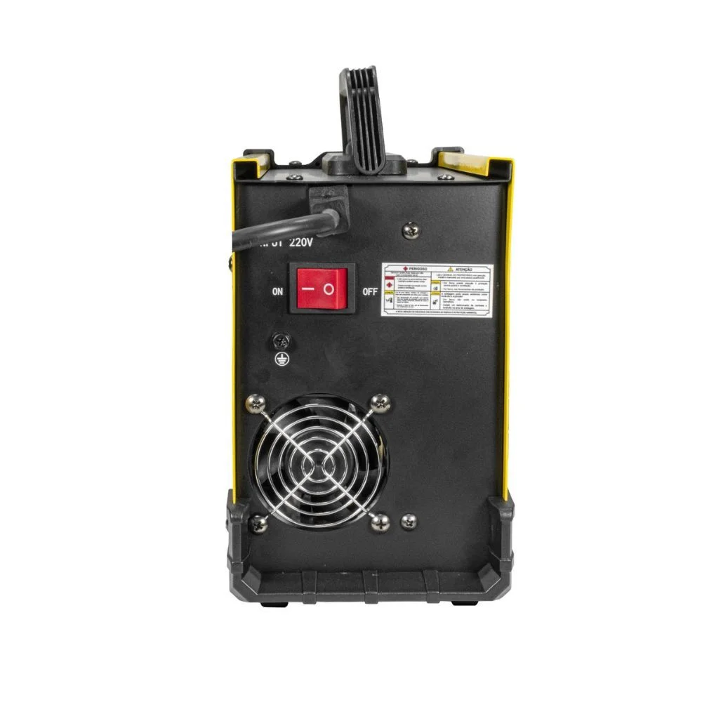 da corrente de saída e de tensão, com botão de seleção das funções MIG, TIG e Eletrodo Revestido.