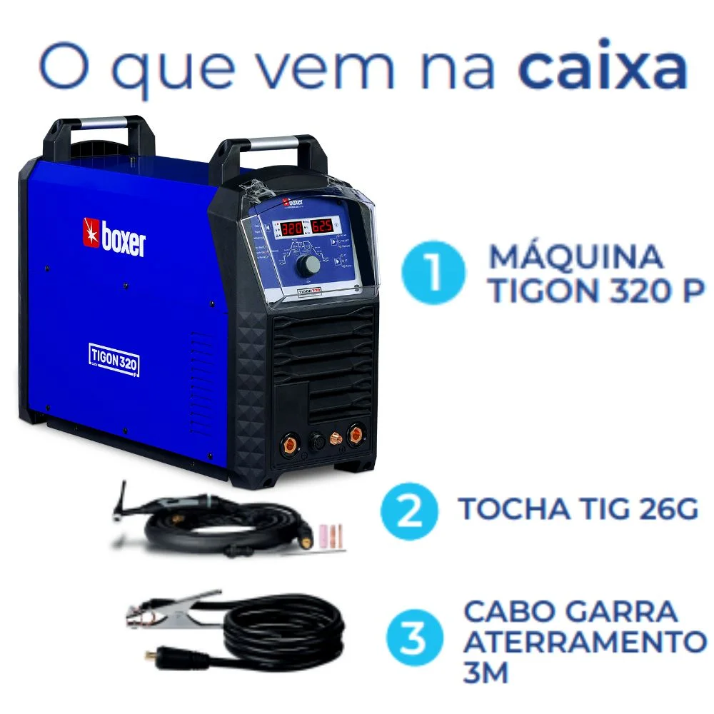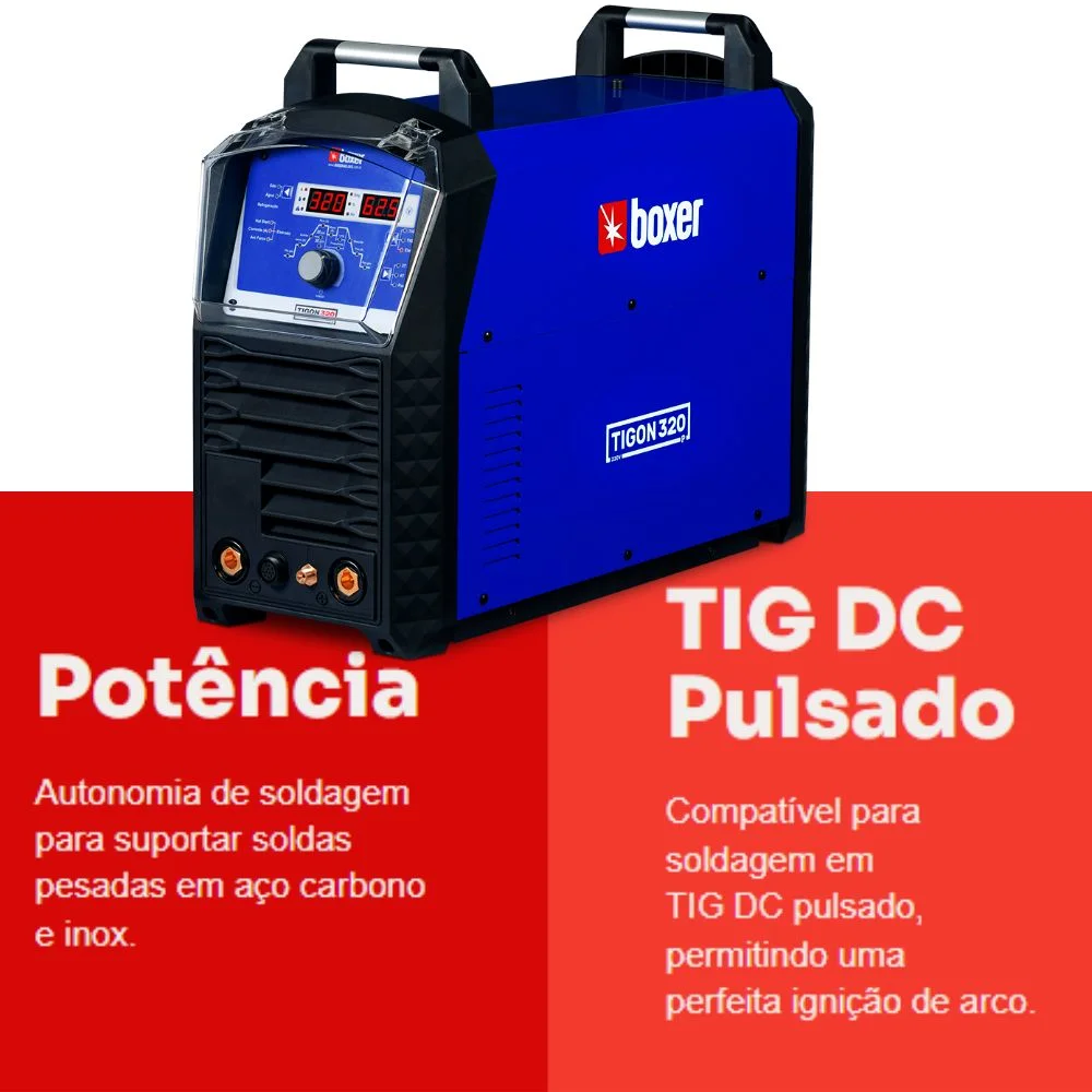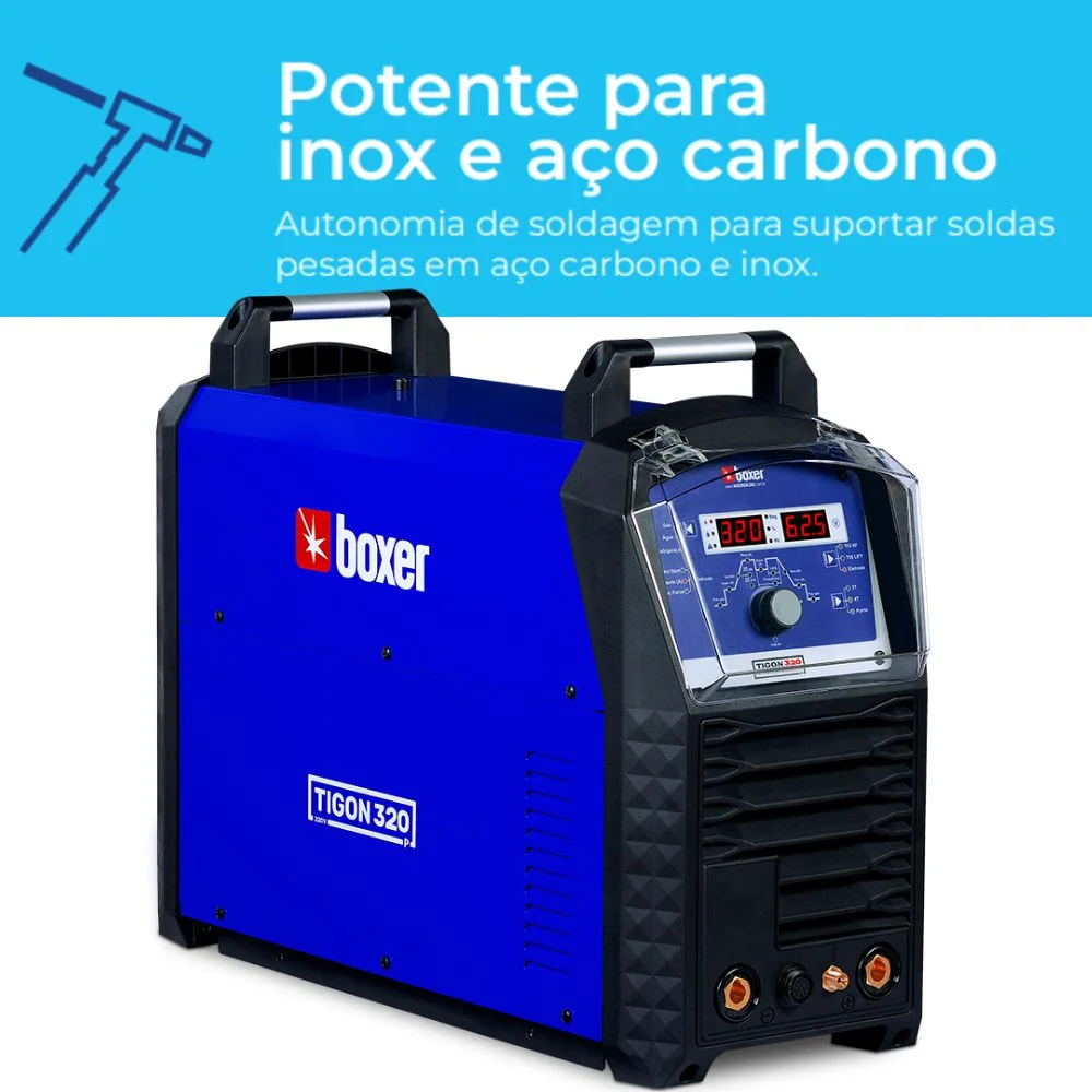 Máquina Inversora de Solda Tigon 320 da Boxer, é uma inversora de solda industrial potente e robusta, pronta para soldas pesadas no processo TIG, indicada diretamente para tubulações, funilaria, reparos, preenchimentos e trabalhos que detém de acabamento geral. Nela, é possível ter mais de 10 diferentes customizações para realizar soldas detalhadas e exigentes. Possui o processo de soldagem primário para TIG HF, Lift TIG e secundário para Eletrodo Revestido. É ideal para soldar em uma corrente de solda de 250 Amperes SEM PARAR, devido ao seu ciclo de trabalho eficiente, alcançando até 320 Amperes.