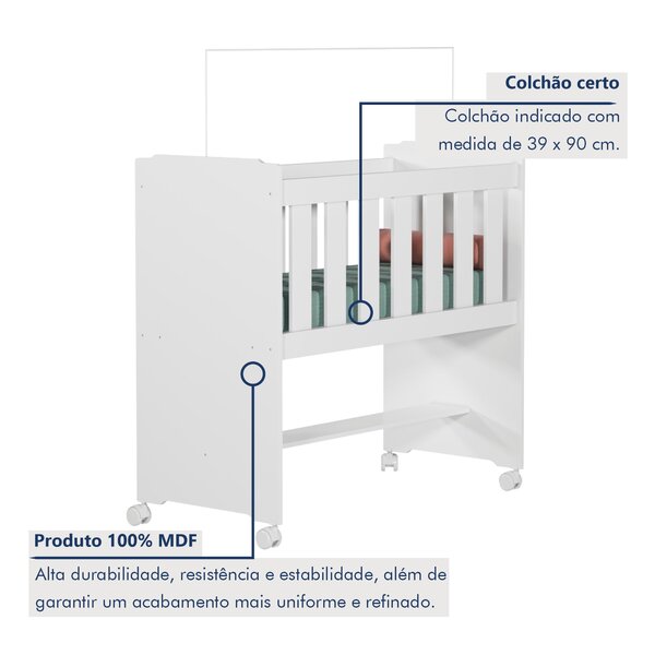 Mini berço 100% mdf com rodízios . O mini berço 100% mdf com rodízios oferece conforto e praticidade para o quarto do bebê. Com design seguro e funcional, ele conta com rodízios para facilitar o movimento, permitindo que você desloque o berço com facilidade. A estrutura em mdf oferece durabilidade e resistência, enquanto o colchão incluso garante o conforto necessário para uma boa noite de sono. O berço é fácil de movimentar? Sim, os rodízios facilitam o deslocamento do berço pelo ambiente.
