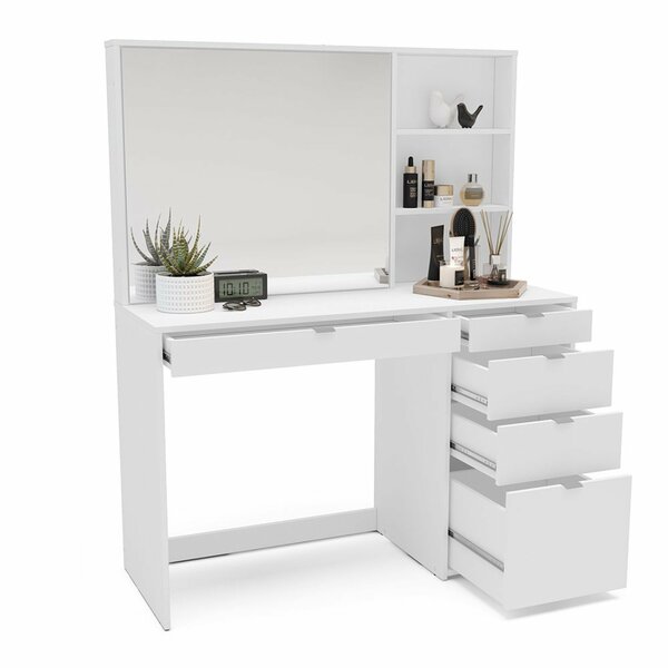 além das gavetas, a penteadeira conta com 3 nichos adicionais, ideais para armazenar outros objetos de decoração ou itens que você deseja manter à mão. O amplo espelho integrado proporciona uma visão clara e completa do rosto, tornando a aplicação de maquiagem mais precisa e facilitando o processo de arrumação do cabelo.