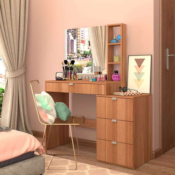 Que tal a penteadeira sume?na hora de garantir um espacinho pessoal onde você poderá guardar aqueles cosméticos e maquiagens mais amados, conte com a penteadeira sume. Com tampo amplo, nichos e gavetas para ajudar na organização, ela tem também um espelho para te ajudar a criar a make perfeita em um cômodo com cara de camarim. A tonalidade ainda facilita a hora de combiná-la com o restante do mobiliário do quarto ou closet e compor o espaço dos seus sonhos sem perder o bom gosto e originalidade. Tudo de bom, né?